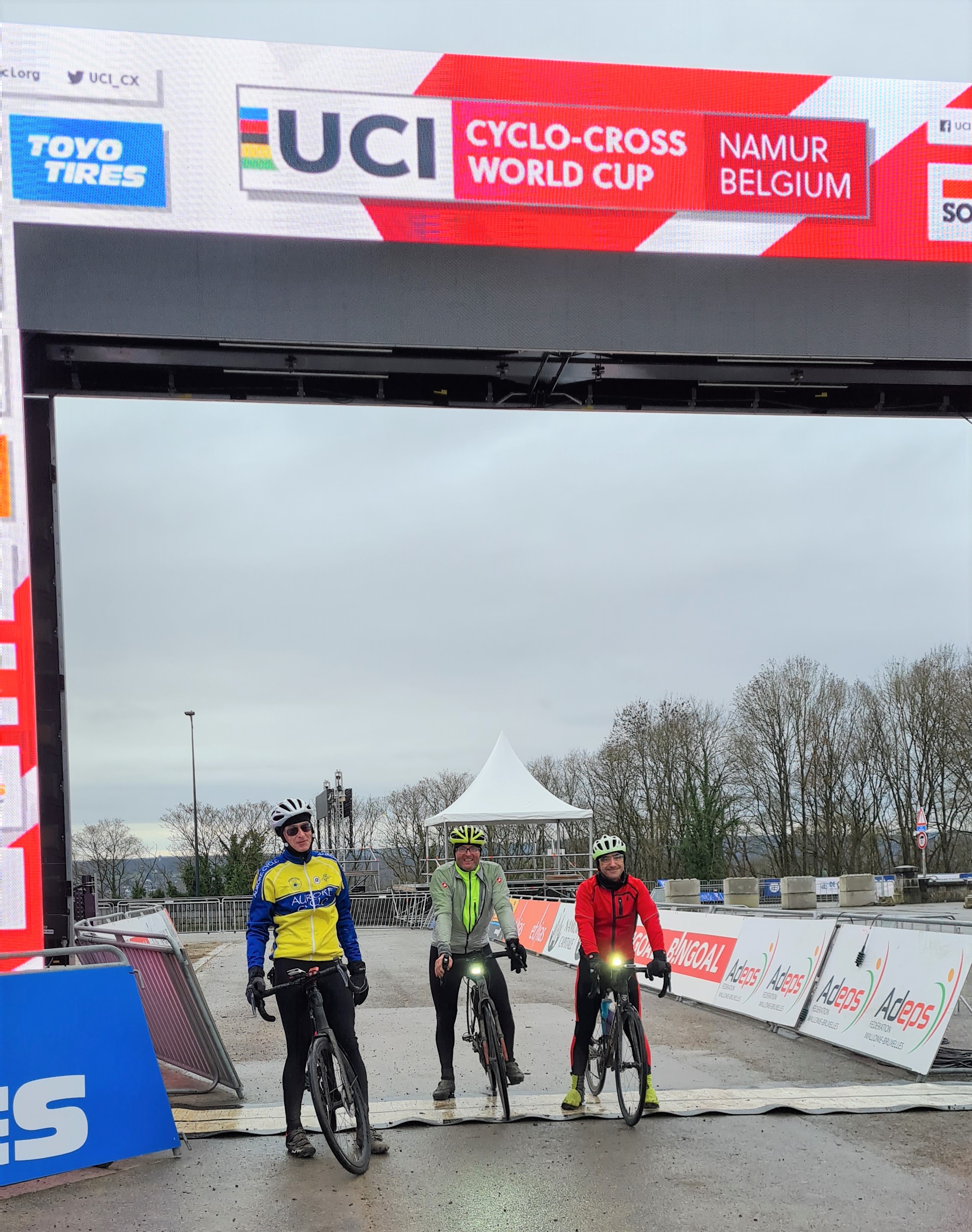 A la citadelle de Namur, montée par la route par laquelle d’habitude on descend, c’est l’infrastructure du Cyclo-Cross de Namur qui bloque un peu le passage. Serge demande une photo au sommet à un organisateur, qui bien gentiment en fait 2. Mais la descente par la route en pavé est très jolie avec la vue sur le Meuse.